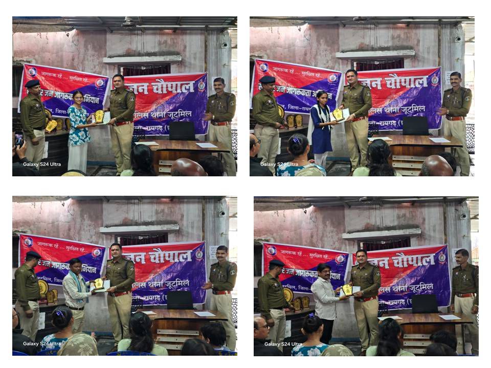 सामुदायिक पुलिसिंग में सक्रिय भूमिका निभाने वाले पुलिस सहयोगी श्री चन्द्रशेखर चौधरी एवं श्री डोलेश्वर यादव, दोनों निवासी छातामुड़ा वार्ड क्रमांक 41, ग्राम कोटवार केनापाली श्री जीवन लाल चौहान एवं ग्राम कोटवार मिट्ठुमुड़ा श्रीमती आशा बाई चौहान, साथ ही शहर को स्वच्छ बनाए रखने में योगदान दे रही स्वच्छता दीदी श्रीमती बबली टंडन (कयाघाट) एवं श्रीमती दिलबाई सोनी (फटहामुड़ा) को भी प्रशस्ति देकर सम्मानित किया गया। कार्यक्रम में थाना जूटमिल का समस्त पुलिस स्टाफ उपस्थित रहा और सभी ने सम्मानित नागरिकों के कार्यों की सराहना की।