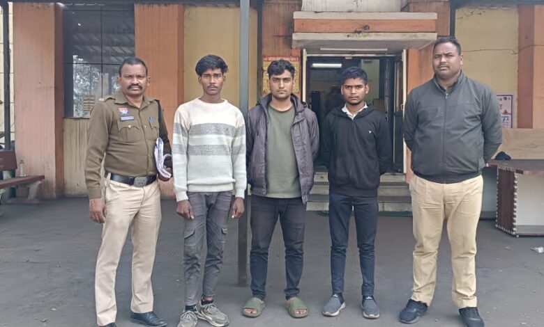 गोपी किशन सोनझरी पिता कमल प्रसाद सोनझरी उम्र 22 वर्ष पता खमरिया बिलासपुर (छग),दुर्गेश कुमार साहू पिता दीनदयाल साहू उम्र 22 वर्ष पता धतूरा कोरबी थाना हरदी बाजार जिला कोरबा,अतीक मेमन पिता अवेज मेमन उम्र 26 वर्ष पता हरदी बाजार थाना हरदीबाजार जिला कोरबा को गिरफ्तार करते हुए न्यायालय में पेश कर जेल दाखिल कराया गया है। अन्य आरोपियों की तलाश जारी है।