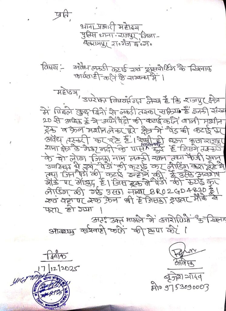 आवेदन में उल्लेख किया गया कि राजपुर क्षेत्र में पिछले कुछ दिनों से लकड़ी तस्कर सक्रिय हैं इनकी संख्य 20 से अधिक है जिनके द्वारा पेड़ों की कटाई करने वाली मशीन ट्रक व क्रेन मशीन लेकर पूरे क्षेत्र में पेड़ो की कटाई कर अवैध तस्करी की जा रही है।