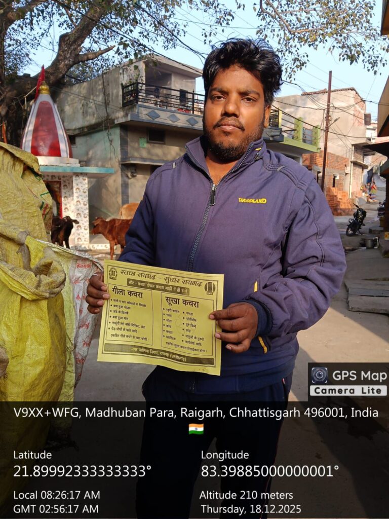 रायगढ़। नगर निगम रायगढ़ द्वारा शहर को स्वच्छ, सुंदर एवं कचरा मुक्त बनाने के उद्देश्य से सघन स्वच्छता अभियान चलाया जा रहा है। इस अभियान के तहत स्वच्छता दीदियों द्वारा घर-घर एवं दुकानों में पहुंचकर नागरिकों को गीला एवं सूखा कचरा अलग-अलग (सेग्रीगेशन) कर के देने के लिए जागरूक किया जा रहा है। नागरिकों से अपील की जा रही है कि वे कचरा निर्धारित समय पर नगर निगम के वाहनों को ही दें तथा सड़क, नाली या सार्वजनिक स्थानों पर कचरा न फेंकें।