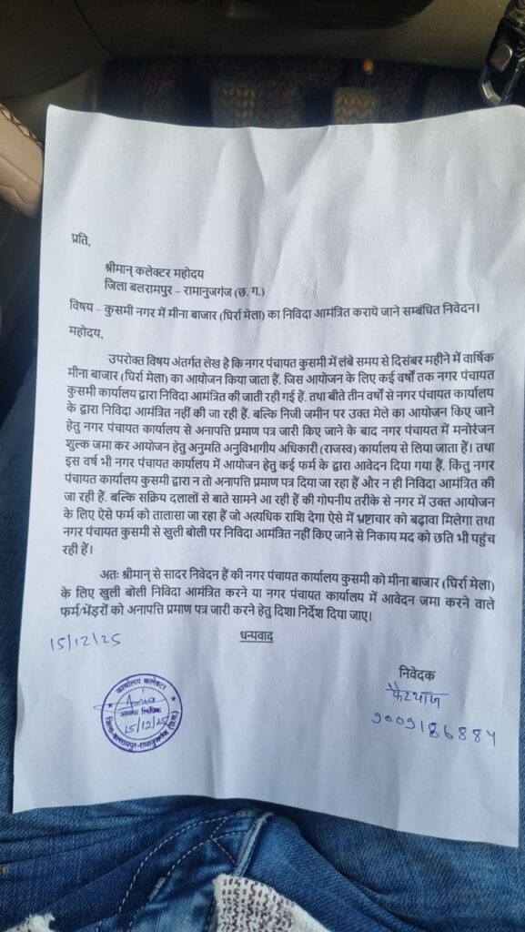 कलेक्टर बलरामपुर को लिखें गए पत्र में उल्लेखित किया गया हैं कि नगर पंचायत कुसमी में लंबे समय से दिसंबर महीने में वार्षिक मीना बाजार (घिर्रा मेला) का आयोजन किया जाता हैं. जिस आयोजन के लिए कई वर्षों तक नगर पंचायत कुसमी कार्यालय द्वारा निविदा आमंत्रित की जाती रही गई हैं. तथा बीते तीन वर्षों से नगर पंचायत कार्यालय के द्वारा निविदा आमंत्रित नहीं की जा रही हैं. बल्कि निजी जमीन पर उक्त मेले का आयोजन किए जाने हेतु नगर पंचायत कार्यालय से अनापत्ति प्रमाण पत्र जारी किए जाने के बाद नगर पंचायत में मनोरंजन शुल्क जमा कर आयोजन हेतु अनुमति अनुविभागीय अधिकारी (राजस्व) कार्यालय से लिया जाता हैं।