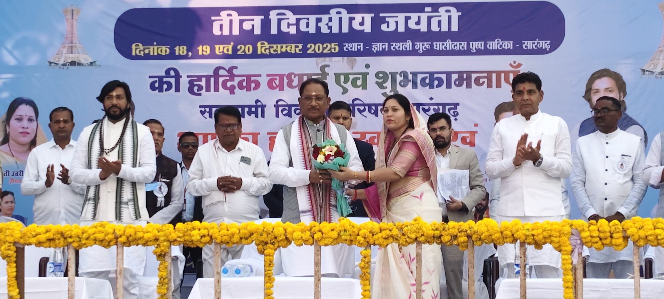 सारंगढ़। परम पूज्य बाबा गुरु घासीदास जी की जयंती के पावन अवसर पर आज गुरु घासीदास पुष्प वाटिका ज्ञानस्थली, सारंगढ़ में भव्य एवं गरिमामय जयंती समारोह का आयोजन किया गया। इस अवसर पर प्रदेश के मुख्यमंत्री श्री विष्णुदेव साय मुख्य अतिथि के रूप में उपस्थित रहे। उनके साथ प्रभारी मंत्री श्री टंकराम वर्मा, कैबिनेट मंत्री गुरु खुशवंत साहेब, सतनामी विकास परिषद के अध्यक्ष श्री बी.डी.भारद्वाज तथा सारंगढ़ विधायक श्रीमती उत्तरी जांगड़े,जिला पंचायत अध्यक्ष संजय भूषण पांडे,जनपद पंचायत अध्यक्ष श्रीमती ममता सिंह, पूर्व विधायक निर्मल सिन्हा,पूर्व विधायक डॉक्टर छबिलाल रात्रे,पूर्व विधायक सुश्री कामदा जोल्हे,पूर्व विधायक केराबाई मनहर विशेष रूप से शामिल हुईं।