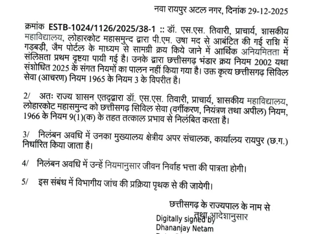 इस मामले में निलंबित किए गए अधिकारियों में प्राचार्य डॉ. एसएस तिवारी के अलावा शासकीय कॉलेज पिथौरा के चार सहायक प्राध्यापक—डॉ. सीमा अग्रवाल, डॉ. बृहस्पत सिंह विशाल, पीठी सिंह ठाकुर और डॉ. एसएस दीवान शामिल हैं। निलंबन अवधि के दौरान इन सभी का मुख्यालय रायपुर स्थित क्षेत्रीय अपर संचालक कार्यालय निर्धारित किया गया है।