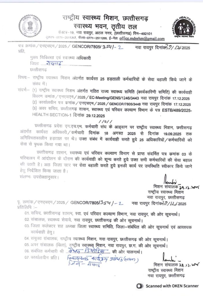 नये साल की पूर्व संध्या पर छत्तीसगढ़ के राष्ट्रीय स्वास्थ्य मिशन (एनएचएम) के संविदा कर्मचारियों को राज्य सरकार ने बड़ी राहत दी है। स्वास्थ्य एवं परिवार कल्याण विभाग के निर्देश पर मिशन संचालक, राष्ट्रीय स्वास्थ्य मिशन छत्तीसगढ़ द्वारा जारी आदेश में हड़ताल अवधि के दौरान की गई प्रशासनिक कार्रवाई को शून्य करते हुए 25 बर्खास्त संविदा अधिकारियों एवं कर्मचारियों की सेवा बहाली का निर्णय लिया गया है।
