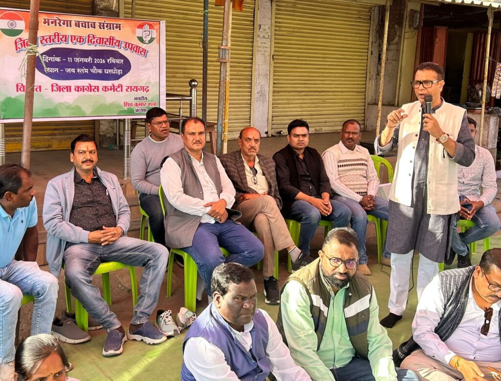 रायगढ़ | भारतीय राष्ट्रीय कांग्रेस द्वारा देशभर में चलाए जा रहे “मनरेगा बचाव संग्राम” (राष्ट्रीय कार्यक्रम) के अंतर्गत जिला कांग्रेस कमेटी रायगढ़ ग्रामीण के नेतृत्व में आज जय स्तंभ चौक, घरघोड़ा में जिला स्तरीय एक दिवसीय उपवास एवं प्रतीकात्मक विरोध कार्यक्रम का आयोजन किया गया। यह कार्यक्रम केंद्र की भाजपा सरकार द्वारा मनरेगा को कमजोर करने और गरीबों से काम करने का संवैधानिक अधिकार छीनने की साजिश के खिलाफ आयोजित किया गया।