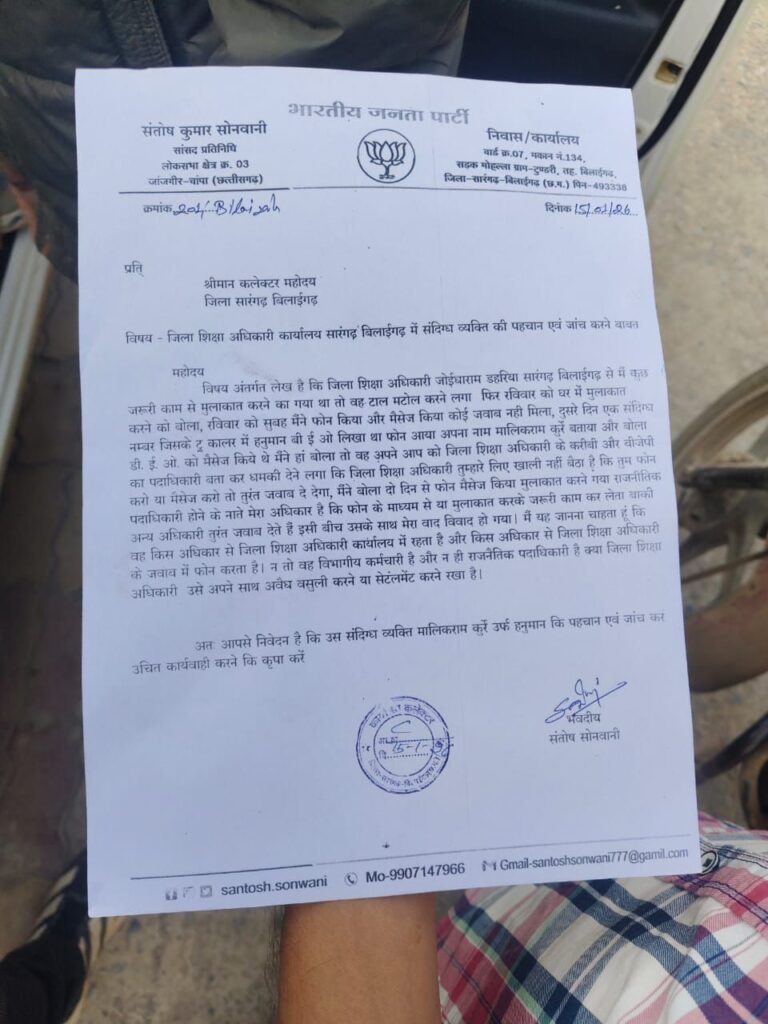 कलेक्टर को दिए गए शिकायत पत्र में सांसद प्रतिनिधि ने बताया कि आवश्यक शासकीय कार्य को लेकर जिला शिक्षा अधिकारी से संपर्क करने का प्रयास किया गया, लेकिन लगातार टालमटोल रवैया अपनाया गया। इसके बाद एक अज्ञात मोबाइल नंबर से कॉल आया, जिसकी कॉलर आईडी में “हनुमान बीईओ” लिखा हुआ था। कॉल करने वाले व्यक्ति ने अपना नाम मालिकराम कुर्रे बताया और स्वयं को जिला शिक्षा अधिकारी का करीबी तथा भारतीय जनता पार्टी का पदाधिकारी बताते हुए कथित तौर पर धमकी दी।