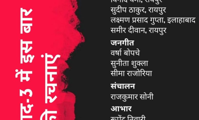 जसम के इस महत्वपूर्ण आयोजन में संस्कृतिकर्मी वर्षा बोपचे,सुनीता शुक्ला और सीमा राजोरिया द्वारा जनगीतों की प्रस्तुति दी जाएगी. कार्यक्रम का संचालन पत्रकार राजकुमार सोनी एवं आभार रूपेंद्र तिवारी द्वारा किया जाएगा.