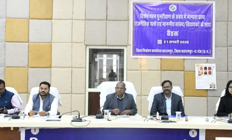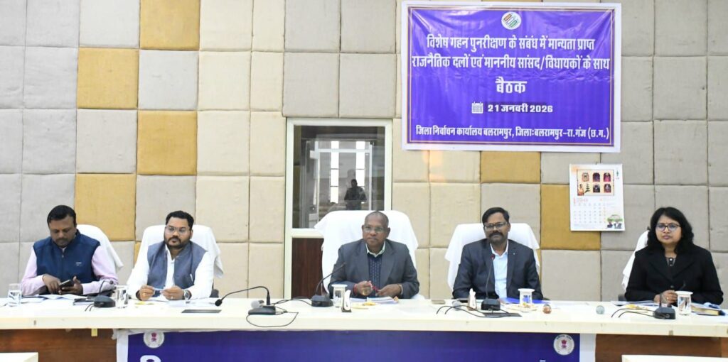 बलरामपुर, 21 जनवरी 2026/ सरगुजा संभागायुक्त एवं रोल आब्जर्वर श्री नरेन्द्र कुमार दुग्गा की उपस्थिति में संयुक्त जिला कार्यालय भवन के सभाकक्ष में निर्वाचक नामावलियों का विशेष गहन पुनरीक्षण (एसआईआर) अर्हता तिथि 01 जनवरी 2026 के संबंध में राजनीतिक दलों के अध्यक्ष/प्रतिनिधियों के साथ बैठक आयोजित की गई।