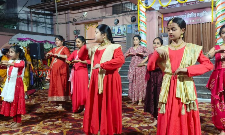 जिसमें इशिका सरकार,छबि ठाकुर,जान्हवी प्रसाद, पलक मिश्रा,योगिता पटेल,योगिता भगत,सृष्टि पतंगीवार,काम्या विश्वकर्मा,अरात्रिका साहू और प्राची सारथी ने मोहक प्रस्तुति दी।इसी तरह वीणा वादिनी वरदे (कथक प्रथम वर्ष ‘ब’) में आद्या चौधरी,छकुली महेश कुर्वे,तान्या शेष,विधि शेष,माधवी यादव,मान्यता जगवानी,संजना सिंह , सायंतिका मुखर्जी,मानसी देवांगन, समीक्षा गुप्ता,जिया कुमारी,जिज्ञासा कुमारी ने नृत्य कला का प्रदर्शन किया।श्रीकृष्ण निरतत थुंग थुंगा गीत पर अक्षा बेहराजान्हवी राठिया, निष्ठा आदित्य,वंशिका झरिया,सगुन देवांगन ने कलात्मक प्रस्तुति दी।
