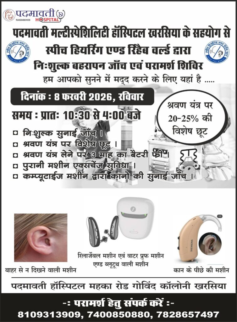 खरसिया: सुनने में परेशानी से जूझ रहे लोगों के लिए राहत की खबर है। पदमावती मल्टीस्पेशिलिटी हॉस्पिटल, खरसिया के तत्वावधान में स्पीच हियरिंग एंड रिहैब वर्ल्ड के सहयोग से 8 फरवरी 2026, रविवार को निःशुल्क बहरापन जाँच एवं परामर्श शिविर का आयोजन किया जा रहा है। यह शिविर प्रातः 10:30 बजे से शाम 4:00 बजे तक चलेगा।