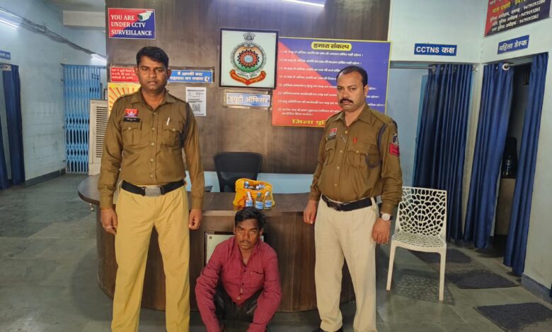 आरोपी मुरलीधर चौहान (41 वर्ष), निवासी उच्चभिट्ठी के कब्जे से 35 पाव रोमियो देशी शराब (कुल 6.300 लीटर), अनुमानित कीमत 2,800 रुपये जप्त की गई।