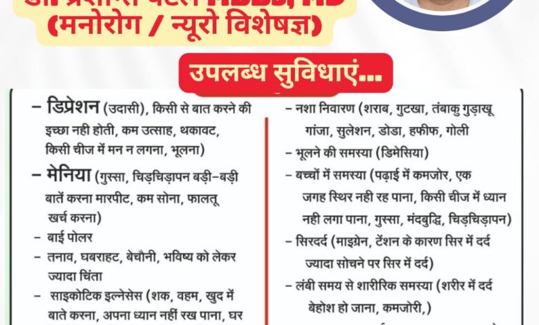 डॉ. प्रशांत पटेल MBBS, MD (मनोरोग/न्यूरो विशेषज्ञ) देंगे मरीजों को सीधे काउंसलिंग और इलाज