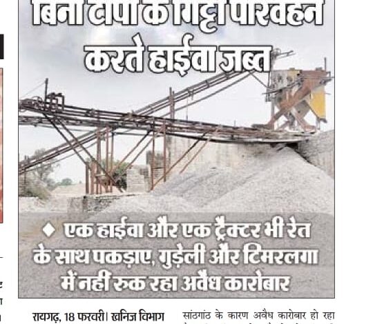 वही रायगढ़ माइनिंग की कार्यवाही को बता दें कि 18 फरवरी को खनिज विभाग ने पुसौर क्षेत्र में जांच की तो वाहन क्रमांक (1) सीजी 13 एवी 1585 हाईवा मालिक सुभाषचंद्र पटेल, (2) वाहन क्रमांक सीजी 13 बीई 7400 हाईवा मालिक मुरली साव निवासी कांदागढ़ और एक ट्रेक्टर सीजी 13 एपी 3984 को बिना रॉयल्टी के जब्त कर तीनों वाहनों को पुसौर थाने में सुपुर्द किया गया है