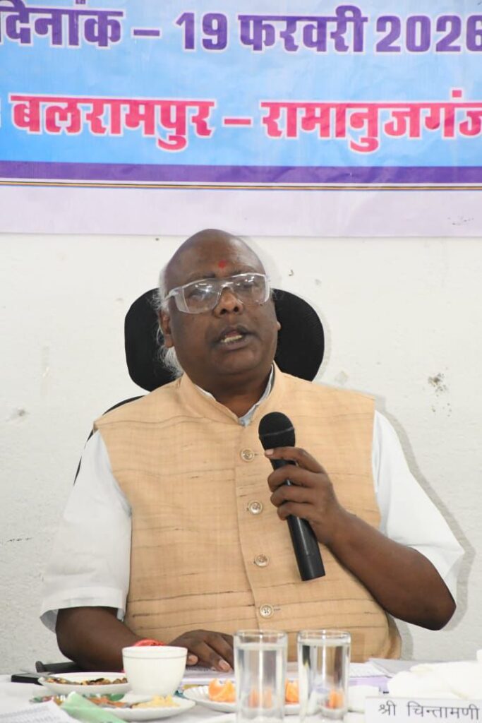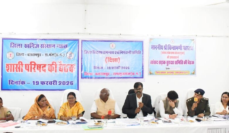 बलरामपुर, 19 फरवरी 2026/ जनपद पंचायत राजपुर के सभाकक्ष में जिला खनिज संस्थान न्यास की शासी परिषद, सांसद सड़क सुरक्षा समिति एवं जिला पशु रोगी कल्याण समिति की बैठक आयोजित हुई। बैठक में प्रदेश के आदिम जाति विकास, कृषि एवं किसान कल्याण मंत्री श्री रामविचार नेताम वर्चुअल रूप से जुड़े। इस दौरान सरगुजा सांसद श्री चिंतामणि महाराज, सामरी विधायक श्रीमती उद्देश्वरी पैंकरा, प्रतापपुर विधायक श्रीमती शकुंतला पोर्ते, जिला पंचायत अध्यक्ष श्रीमती हीरामुनी निकुंज, कलेक्टर श्री राजेंद्र कटारा, पुलिस अधीक्षक श्री वैभव बैंकर, वनमंडलाधिकारी श्री आलोक वाजपेयी, जिला पंचायत सीईओ श्रीमती नयनतारा सिंह तोमर, अपर कलेक्टर श्री आर.एन. पाण्डेय, जनपद एवं नगरीय निकायों के अध्यक्ष व उपाध्यक्ष सहित अन्य जनप्रतिनिधि एवं विभागीय अधिकारी उपस्थित थे।