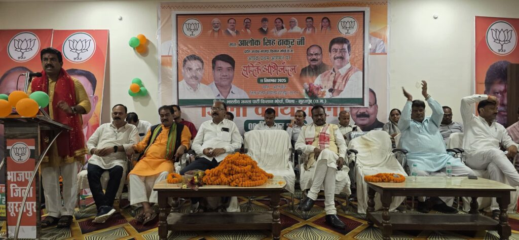 सूरजपुर कौशलेन्द्र यादव। भारतीय जनता पार्टी किसान मोर्चा के नवनियुक्त प्रदेश अध्यक्ष आलोक सिंह ठाकुर के प्रथम आगमन पर गुरुवार को जिला भाजपा कार्यालय सूरजपुर में भव्य स्वागत किया गया। ढोल-नगाड़ों और कार्यकर्ताओं के उत्साहपूर्ण नारों के बीच ठाकुर का स्वागत भाजपा पदाधिकारियों और किसान मोर्चा के कार्यकर्ताओं ने गर्मजोशी से किया।