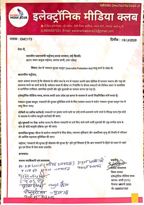 Basti जिले में इलेक्ट्रॉनिक मीडिया से जुड़े पत्रकारों ने मंडलायुक्त को प्रधानमंत्री नरेंद्र मोदी के नाम एक ज्ञापन सौंपा। इस ज्ञापन में पत्रकारों की सुरक्षा और उनके अधिकारों को सुनिश्चित करने के लिए ठोस एवं प्रभावी कदम उठाने की मांग की गई। पत्रकारों ने इसे लोकतंत्र के चौथे स्तंभ की सुरक्षा से जुड़ा गंभीर विषय बताया।