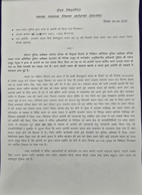 कोरबा में जमीन विवाद ने लिया खौफनाक रूप, बड़े भाई ने डंडे से पीट-पीटकर छोटे भाई की हत्या, आरोपी गिरफ्तार