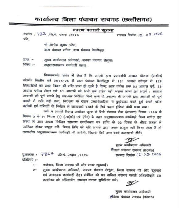 जारी नोटिस के अनुसार वित्तीय वर्ष 2025-26 में ग्राम पंचायत वैस्कीमुड़ा में 131 प्रधानमंत्री आवास स्वीकृत हुए थे, जिनमें से 128 हितग्राहियों को पहली किश्त मिल चुकी है, लेकिन स्थिति बेहद खराब पाई गई—
