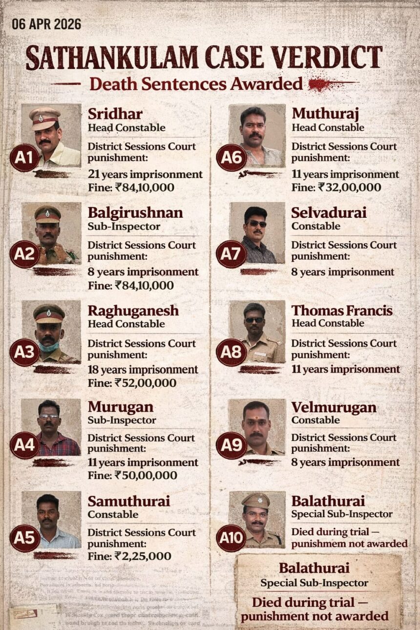 मदुरै। तमिलनाडु के बहुचर्चित सथानकुलम हिरासत हत्या मामले में मदुरै की प्रथम अतिरिक्त जिला एवं सत्र न्यायालय ने सोमवार को बड़ा फैसला सुनाया है। अदालत ने 2020 में पिता-पुत्र जयराज और बेनिक्स की मौत के मामले में दोषी पाए गए सभी नौ पुलिस अधिकारियों को मौत की सजा सुनाई है।