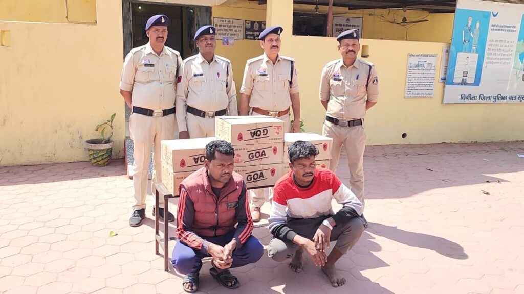 इसी क्रम में दिनांक 02.03.2026 के रात्रि में थाना सूरजपुर पुलिस के द्वारा चेक प्वाईंट लगाकर वाहनों की जांच की जा रही थी इसी दौरान वहां सेन्ट्रो कार क्रमांक सीजी 13 सी 1907 पहुंची, जिसमें 2 व्यक्ति कामेश्वर सिंह पिता रमेश सिंह उम्र 20 वर्ष व दिलबोधन सिंह पिता समयलाल उम्र 30 वर्ष दोनों निवासी ग्राम निम्हा थाना उदयपुर जिला सरगुजा मिले। कार की तलाशी लेने पर उसमें गोवा अंग्रेजी शराब 350 नग (7 पेटी) कीमत 42 हजार रूपये का पाया गया।