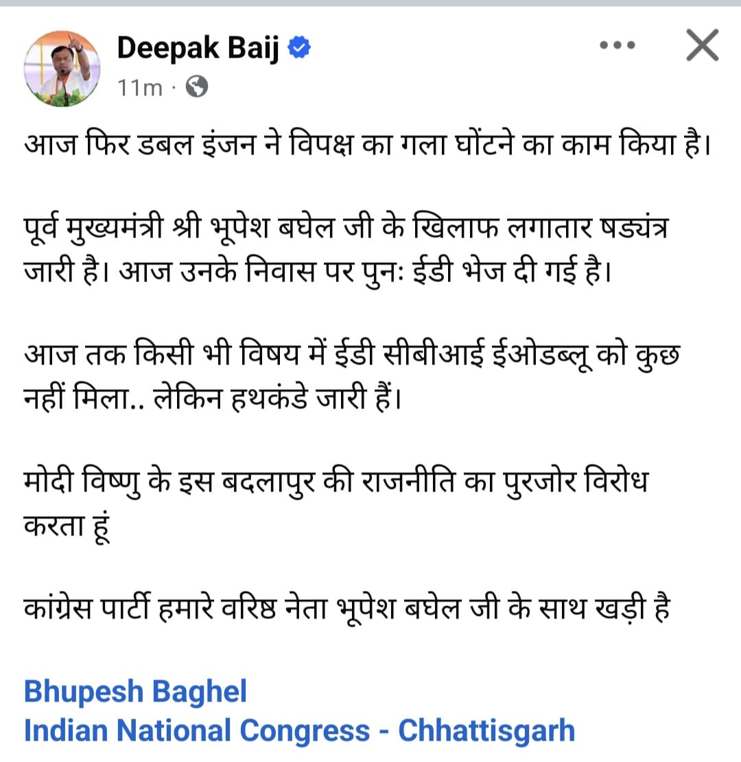 पीसीसी चीफ दीपक बैज ने सोशल मीडिया पर लिखा